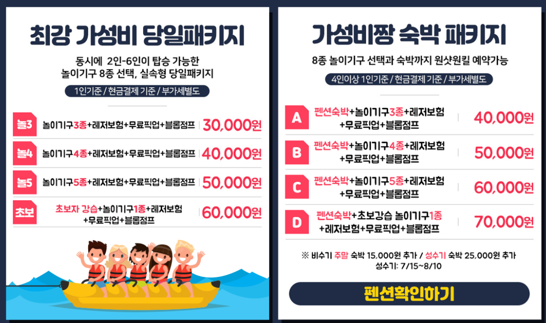 - 즐길거리 : 각종 놀이기구 (바나나보트, 땅콩보트, 빅 마블, 바이퍼, 후퍼, 유토...), 셀프바, 바비큐, 히노끼탕, 가든 카페, 애견카페, 노래방, 풀파티