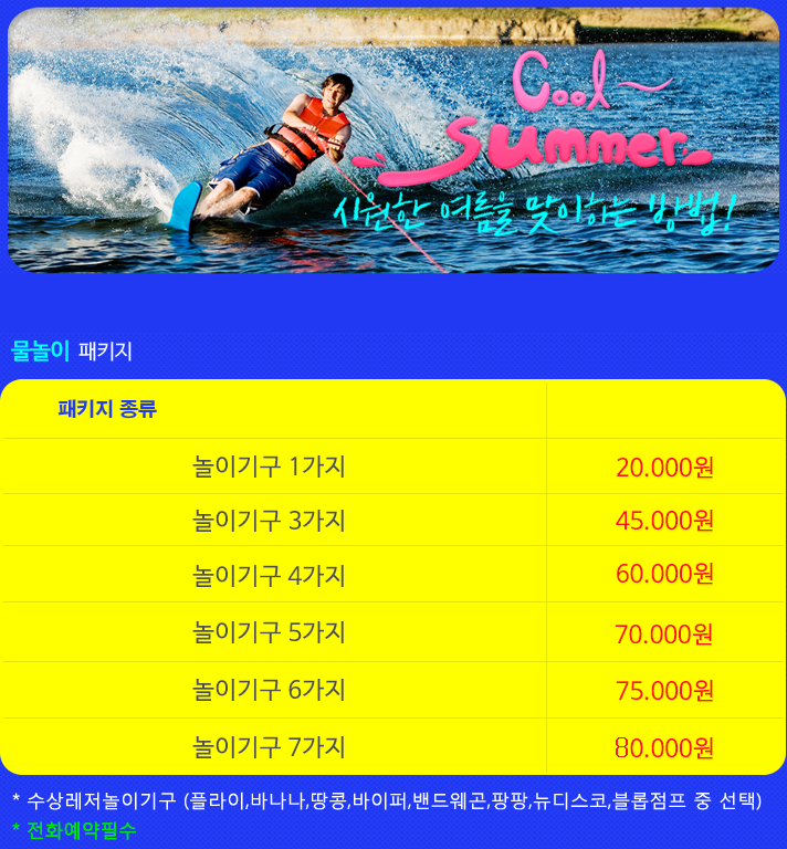- 놀이기구 : 웨이크보드, 수상스키, 하이롤러, 블롭점프, 디스코 보트, 호떡, 땅콩, 바나나보트, 단군, 와일드 팡팡..