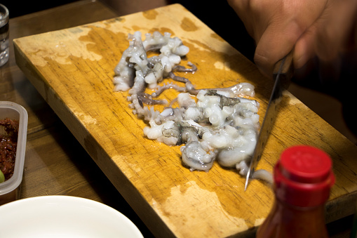 - 산낙지를 쭉 펴서 도마에 놓고 칼을 낙지에 대고 밀듯이 잘라주세요.