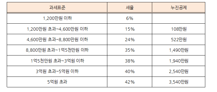 1200만 원 이하는 6%의 세율을 적용받고 이후 4,600만 원/8,800만 원/1.5억 원/5억 원/10억 원 단위로 세율이 달리 적용된다. 참고로 10억 초과의 경우 최고세율인 45%를 적용받습니다.
