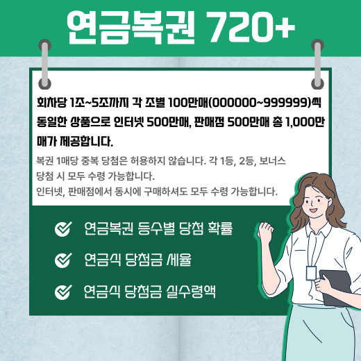 연금복권은 1,2 등 동시 당첨 가능한 복권으로, 동시에 당첨이 되었을 때 실수령액은 월 858만 원을 20년 동안 받을 수 있습니다.