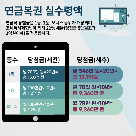 연금복권의 세금은 22%의 제세공과금이 부과됩니다.